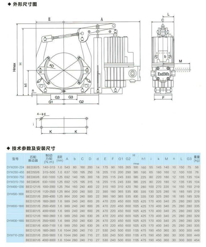 DYW,BYWZ5系列制動器連接尺寸和技術要求符合JB/T6406-2006標準,制動力矩參數符合DIN15435標準。DYWZ5系列制動器連接尺寸和制動力矩參數符合GB6333-86標準,技術要求符合JB/T6406-2006標準。DYW和DYWZ5系列鼓式制動器配套符合GB3836.2的Ed系列隔爆型推動器。本系列適用ⅡA、ⅡB、ⅡC溫度組別為T1-T4組可燃氣體與空氣形成的爆炸性混合物場所。