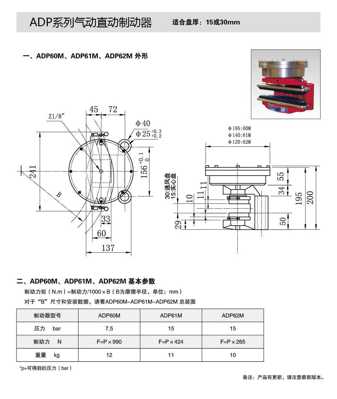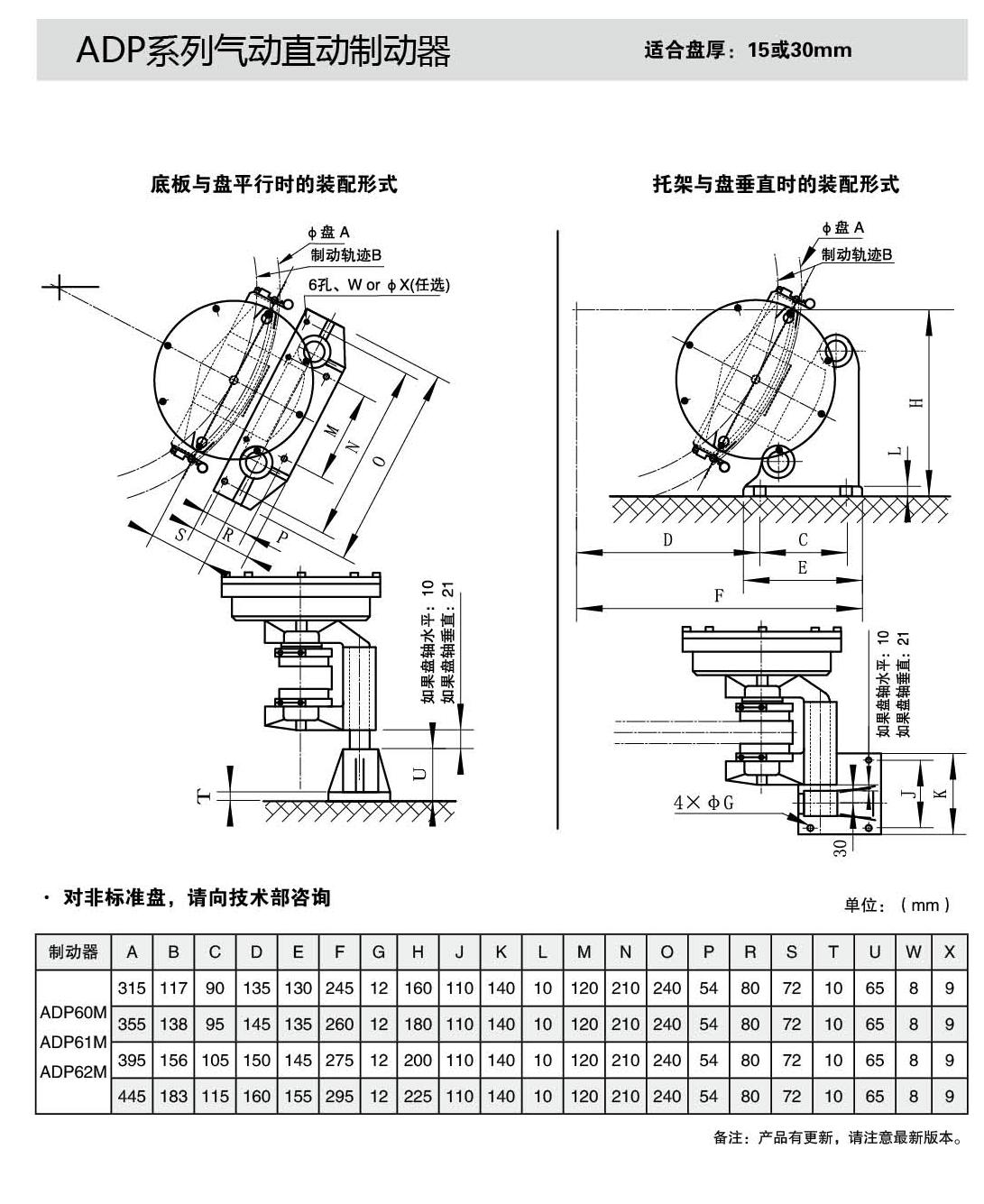 應用:ADP 系列氣動盤式制動器,廣泛應用于中小型驅(qū)動機構的停車制動或減速制動。卷繞機構的張緊制動,如造紙廠卷紙張緊、新聞印刷時新聞紙的張緊控制、鋼板(鋼絲)卷展開張緊及電線電纜放線、放纜張緊控制等。符合標準:ADP鉗盤式制動器技術要求符合JB/T10917-2008標準。主要特點:▲ PD系列為常閉式設計:彈簧制動,氣動釋放(開閘)▲ 結(jié)構緊湊、體積小、動作靈敏、重量輕、使用方便;▲ 卡裝式無石棉制動襯墊,綠色環(huán)保,更換方便、快捷;▲ 安裝方式:適合于水平軸或垂直軸制動方式