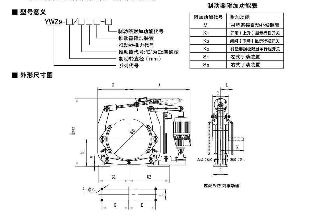 應(yīng)用:YWZ5  YWZ9系列電力液壓鼓式制動(dòng)器,廣泛應(yīng)用于有防爆要求的各種起重運(yùn)輸、皮帶運(yùn)輸、港口裝卸、冶金及建筑機(jī)械中各種機(jī)構(gòu)的減速和停車(chē)(維持)制動(dòng)。符合標(biāo)準(zhǔn):YWZ5系列電力液壓鼓式制動(dòng)器的連接尺寸和制動(dòng)力矩參數(shù)符合GB6333-86標(biāo)準(zhǔn),技術(shù)要求符合JB / T6406-2006標(biāo)準(zhǔn),配套符合DIN15430標(biāo)準(zhǔn)的Ed系列推動(dòng)器。主要特點(diǎn):▲ 聯(lián)鎖式退距均等裝置和瓦塊自動(dòng)隨位裝置,可始終保持兩側(cè)瓦塊退距均等且無(wú)需調(diào)整,完全避免因退距不均使一側(cè)制動(dòng)襯墊浮貼制